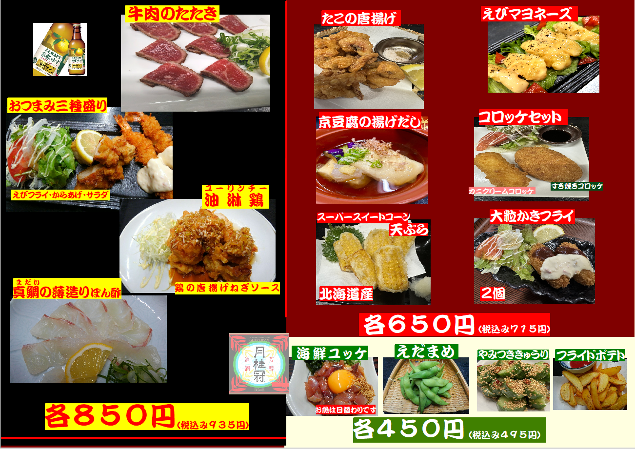 さがのやでは通常メニューに加え、 「おすすめアラカルト」 夜間限定で通常よりもお得になる「夜限定 お得な単品メニュー」 をご用意しております。